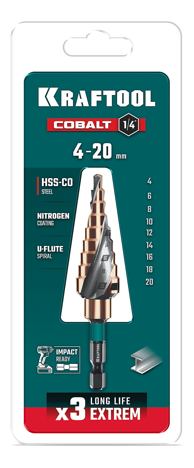Сверло ступенчатое 4-20мм KRAFTOOL 29691-4-20-9 - предназначено для сверления металлических конструкций и заготовок, листовых материалов, цветных металлов, пластика.