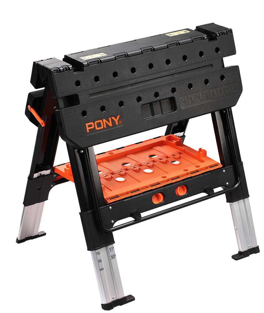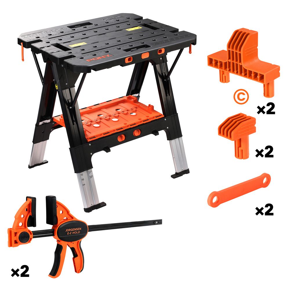 • 2-в-1 складной верстак и козлы Pony оснащены 2-я быстрозажимными струбцинами (серия Medium Duty E-Z HOLD 300мм) и 4-мя удерживающими упорами (2 малых и 2 больших).