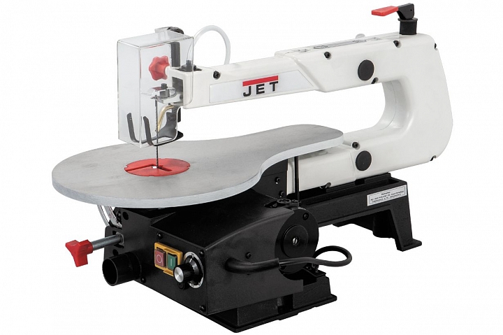 JET JSS-16A – любительский лобзиковый станок для выпиливания сложных радиусов в не слишком крупных заготовках из древесины, ДСП, ДВП, фанеры или пластмассы. Модель представляет собой улучшенную модификацию хорошо известного лобзикового станка Jet JSS-16 и имеет ряд интересных конструктивных особенностей, выгодно отличающих ее от аналогов других марок. Прежде всего, это универсальность в отношении используемых полотен: можно устанавливать пилки как со штифтовым креплением, так и без него. Важно отметить удобное верхнее расположение рычага натяжения полотна. Новое усовершенствование в конструкции – возможность изменить ориентацию плоскости распила: вдоль или поперек продольной оси станка, смотря как удобнее или привычнее оператору.