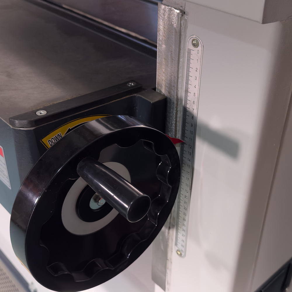 • Рабочий стол изготовлен из серого чугуна, имеет ручной механизм подъёма – опускания и две опорные стойки
