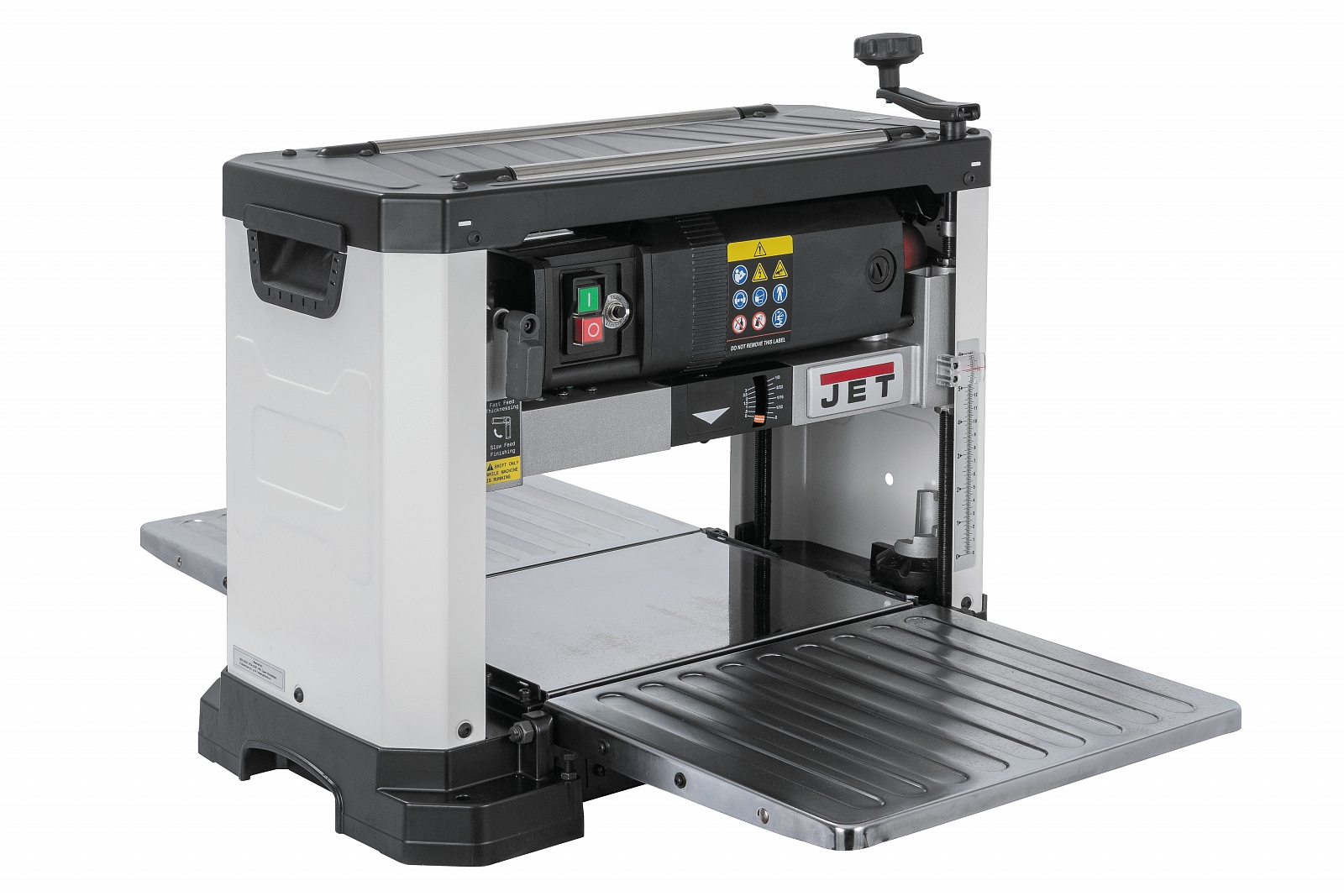 Станок оборудован двухскоростным механизмом подачи, валы имеют резиновое покрытие. Регулировка высоты строгания производится вращение рукоятки сверху, настройку облегчают измерительная миллиметровая шкала и револьверный упор с набором типовых значений толщин пиломатериалов. Предусмотрен измерительный индикатор с щупом для определения глубины съема древесины при строгании заготовки в установленный размер. Сверху корпуса ролики для обратной подачи заготовок.