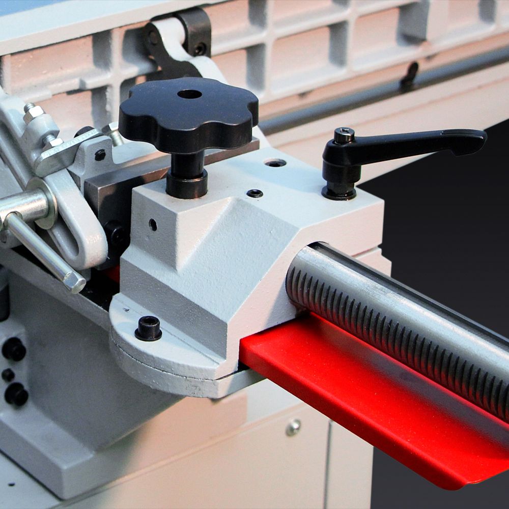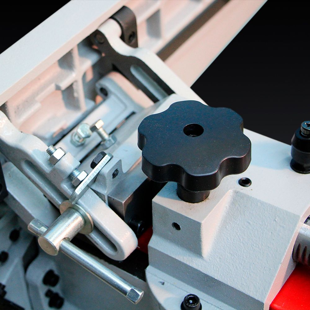 • Приемный столы просто регулируется маховиком с удобной фиксирующей рукояткой. Подающий стол регулируется быстродействующим рычагом.