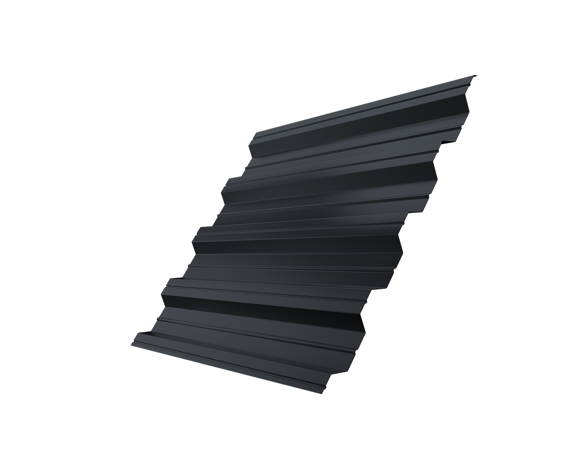 Профиль этого материала несимметричен. Верхняя сторона имеет более динамичный рисунок из узких полочек и применяется для кровли, обратная выглядит более монолитно, рекомендована для прочих сфер применения.