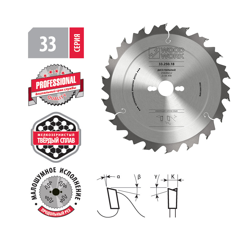 • Количество зубьев 32 и форма заточки – прямой зуб с небольшой фаской, позволяют получить оптимальное соотношение в качестве реза и усилие подачи при продольном пилении, более того такое число зубьев позволяет иногда использовать этот диск и для торцовочных работ