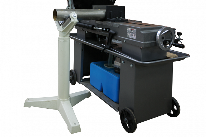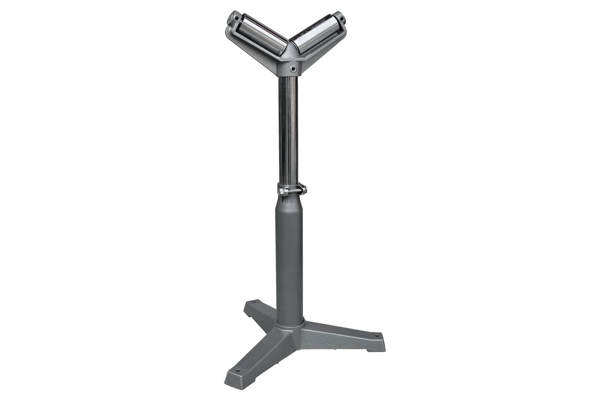 Конструкция выполнена из серого чугуна, имеет регулировку по высоте в диапазоне 600-950 мм. Устойчивое 3-х опорное основание, прочная конструкция обеспечивает оснастке грузоподъемность 200 кг. Масса рольганги составляет 15 кг.