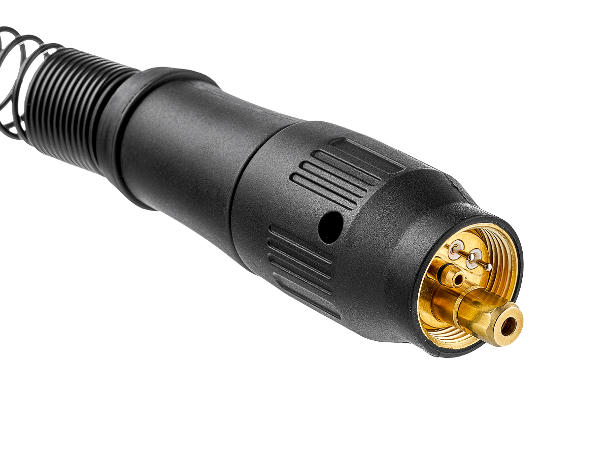 Конструкция горелки предусматривает кнопочное управление и воздушное охлаждение. Соединяется с легким и гибким шланговым пакетом с помощью шарнира, что обеспечивает максимальный комфорт и позволяет проводить сварочные работы продолжительное время без усталости. Наличие пружины на основании горелки предотвращает перегиб и повреждение шлейфа в месте его соединения с горелкой.