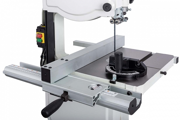 Параллельный упор с эксцентриковым фиксатором перемещается вдоль алюминиевого профиля, закреплённого возле переднего края стола. Для упрощения настройки предусмотрена миллиметровая шкала и увеличительное стекло с риской на корпусе. В качестве опции предлагается чугунная направляющая c двухпозиционным упором 150 мм, направляющий профиль которого в вертикальном положении позволяет надежно фиксировать высокие заготовки при их роспуске на тонкие пластины, в низком – плоские детали, а также для пиления с наклоном.