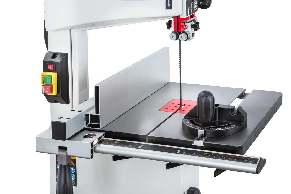 Станок оборудован регулируемым двухпозиционным параллельным упором. Он имеет две рабочие поверхности: высокую для перпендикулярных столу резов и толстых деталей и низкую для наклонного пиления и для плоских заготовок. Упор перемещается вдоль направляющего профиля с миллиметровой шкалой; для удобства позиционирования по ней, на корпусе сделан «целик», состоящий из увеличительного стекла с риской. Также в комплект входит скользящий угловой упор с направляющей вдоль Т-образного паза.