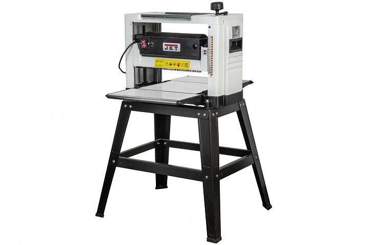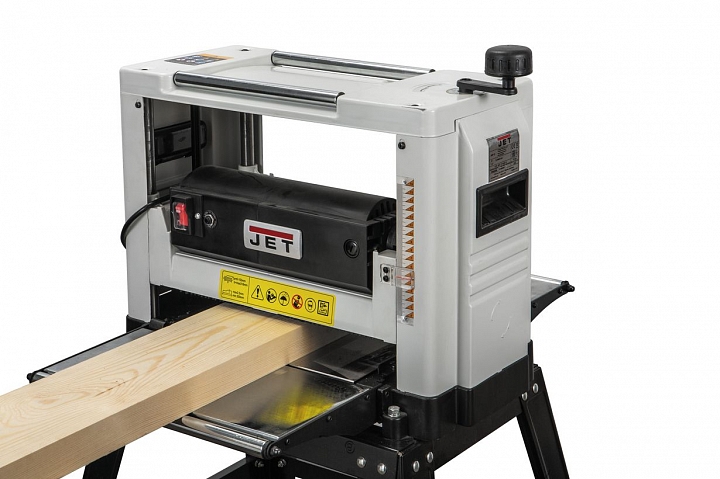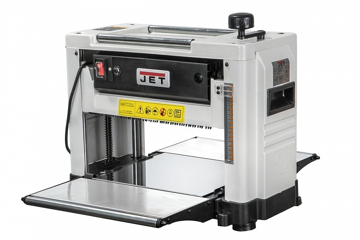 JWP-12 переносной рейсмусовый станок с откидными столами. Несмотря на компактные размеры, оборудован мощным (1800 Вт) тяговитым коллекторным двигателем и позволяет «пропускать» заготовки шириной до 12 дюймов (примерно 300 мм) с высокой производительностью. При тщательной настройке обеспечивает высокое качество рейсмусования, после которого не требуется дополнительная финишная обработка деталей. Подходит для грубого чернового строгания, причем лучше многих других однотипных моделей, поскольку в отличие от них имеет прочные перетачиваемые ножи, зафиксированные в барабане распорными планками, а не узкие одноразовые. Дополнительным преимуществом является запасная пара качественных лезвий из быстрорежущей стали, поставляемая в штатном комплекте. Станок имеет пылесборный кожух с патрубком для подключения к системе аспирации и оборудован типовыми для переносных рейсмусов системами регулировки высоты строгания вращающейся рукояткой и автоматической протяжки заготовки при помощи обрезиненных валов.