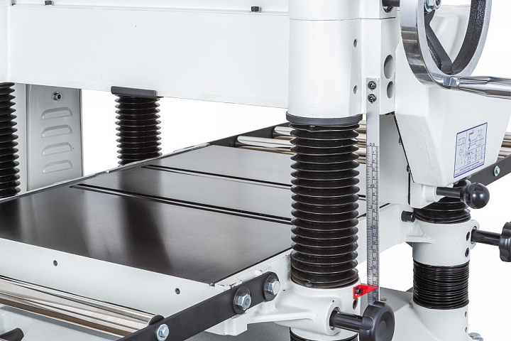 Мощный (более 5 киловатт) двигатель, высокая жёсткость и строгальный вал с четырьмя лезвиями обеспечивают чистую, уверенную и производительную работу по любым породам. В сравнении с более лёгкими моделями этот станок сравнительно тихий.