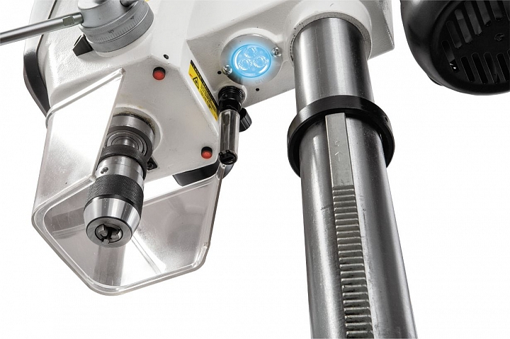 Станок оборудован лазерным указателем центра сверления в виде перекрестья двух лучей и светодиодным фонариком подсветки с регулировкой направления светового луча.