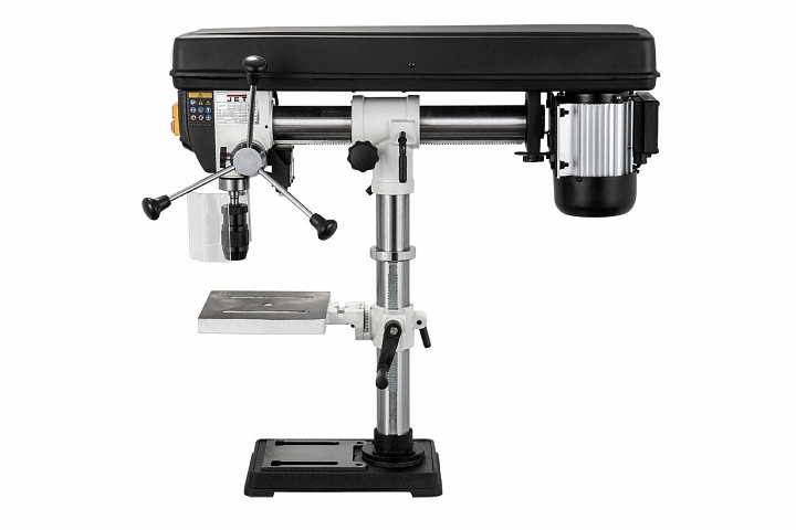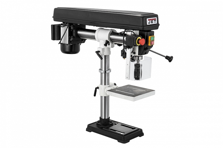 Настольный радиально-сверлильный станок Jet JDR-34 для работы с заготовками из металла, древесины, пластика и других материалов. Имеет расширенные возможности по настройке и регулировке, что выгодно отличает его от моделей стандартной конструкции. Сверлильная часть установлена на горизонтальной цилиндрической направляющей и может перемещаться относительно колонны. Это позволяет регулировать величину вылета: увеличивать, если того требуют размеры заготовки, или уменьшать, что способствует повышению жёсткости. Кроме того, можно сверлить ряд отверстий без переустановки детали. Помимо линейного перемещения возможен и наклон сверлильной части: до 45° в одну сторону и до 90° в другую. При этом все другие регулировки, присущие стандартным станкам, есть и здесь: рабочий стол можно поднять, опустить, наклонить или демонтировать.