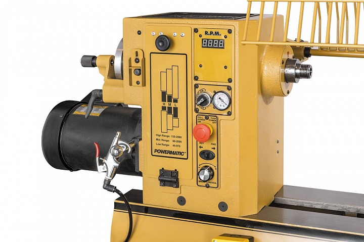 Powermatic 4224B оснащён управляющей электроникой. Это частотный преобразователь для плавной регулировки скорости вращения шпинделя, световая индикация установленного значения, электродинамический тормоз, сокращающий время выбега после выключения и переключатель реверса. Скорость вращения изменяют и перестановкой ремня: предусмотрено три силовых диапазона.