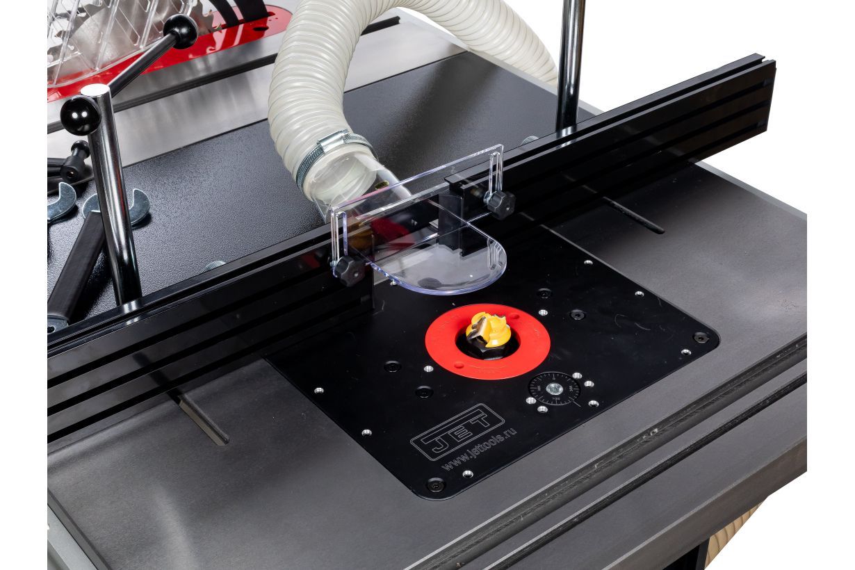Так же для этого фрезерного стола JET специально разработал новую компактную систему удаления стружки (можно приобрести опционально) JRDC-1C (арт. JR030), которую можно закрепить под стол и тогда стружкоудаление, подключенное к любой вытяжной установке станет абсолютно беспроблемным.