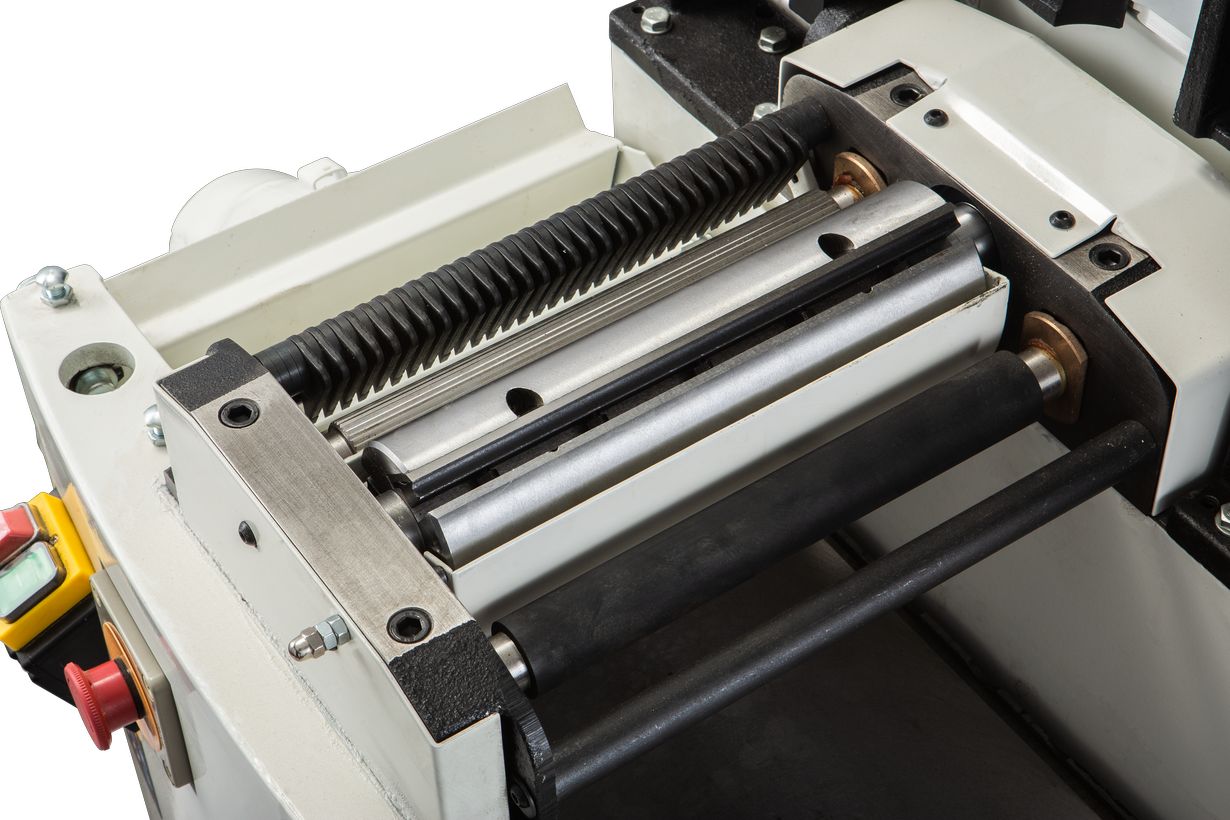 Фугование и рейсмусование производятся как обычно – каких-либо специальных приемов работы не требуется; переналадка почти не занимает времени. Верхний фуговальный модуль, объединяющий в себе оба стола и механизм регулировки глубины строгания, полностью откидывается (при этом ранее сделанные настройки не сбиваются), кожух стружкоудаления переворачивается. Компоновка с откидным верхом дает преимущества как в работе (лучше обзор, более качественно работает стружкоудаление), так и при обслуживании строгального вала, доступ к которому ничем не затруднен.