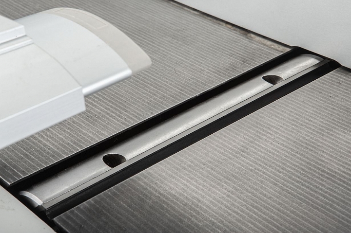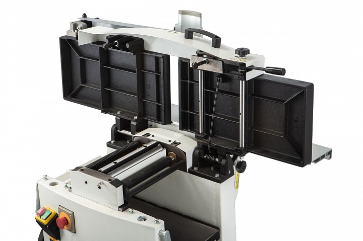 Фугование и рейсмусование производятся как обычно – каких-либо специальных приемов работы не требуется; переналадка почти не занимает времени. Верхний фуговальный модуль, объединяющий в себе оба стола и механизм регулировки глубины строгания, полностью откидывается (при этом ранее сделанные настройки не сбиваются), кожух стружкоудаления переворачивается. Компоновка с откидным верхом дает преимущества как в работе (лучше обзор, более качественно работает стружкоудаление), так и при обслуживании строгального вала, доступ к которому ничем не затруднен.