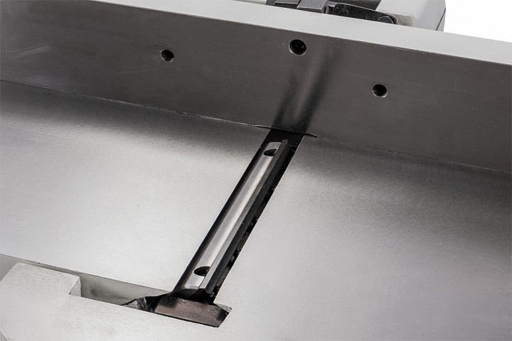 Оба стола регулируются по высоте при помощи винтовых механизмов, приводимых в действие ручками-маховиками. Перемещением подающего (переднего) стола устанавливают глубину строгания, для чего есть соответствующая разметка; принимающий (задний) регулируют только во время обслуживания станка при наладочных операциях. Упор заготовки чугунный, с механизмом наклона (он возможен в обе стороны). Фиксация выбранного положения производится резьбовым зажимом. Ножевой вал укомплектован тремя ножами, допускающими повторную заточку. Их типоразмер и ассортимент такой же, как и у профессиональных фуганков Jet с аналогичной шириной строгания.