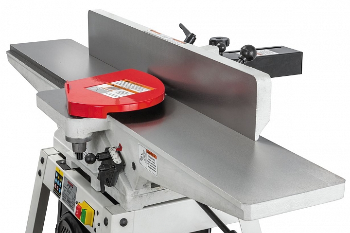 JJ-6HH OS — фуговальный станок для любительского применения с длинными чугунными столами и сегментированным вылом helical. Имеет классический дизайн с регулировкой высоты столов по наклонным направляющим. Базируется на открытой подставке, в пространстве которой расположен асинхронный однофазный двигатель. Привод ножевого барабана одним клиновым ремнем. Регулируемый фуговальный упор и его кронштейн сделаны из массивных чугунных отливок. Сдвижной защитный экран алюминиевый. Удаление стружки производится через 100-миллиметровый патрубок и кожух, расположенные снизу станка.