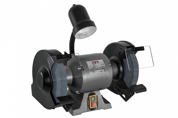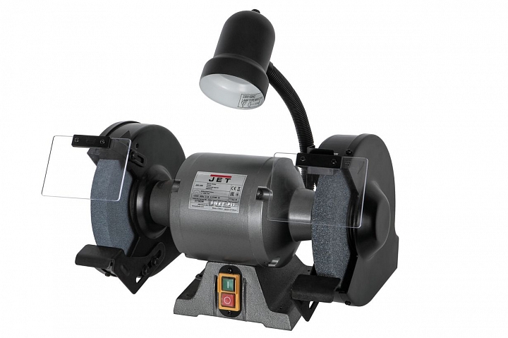 Заточной (наждачный) станок Jet JBG-200 индустриального класса, произведенный на Тайване, с двумя камнями диаметром 200 мм для профессионального применения. У него прочная конструкция с массивным корпусом, качественные пылезащищённые шарикоподшипники ротора и мощный однофазный двигатель, позволяющий уверенно и быстро производить большинство работ по заточке инструмента и обдирке металлических заготовок. Компоновка стандартная: камни расположены на общем валу и закрыты прочными стальными кожухами безопасности, на них установлены регулируемые опоры для инструмента или заготовки и защитные экраны из прозрачного пластика.