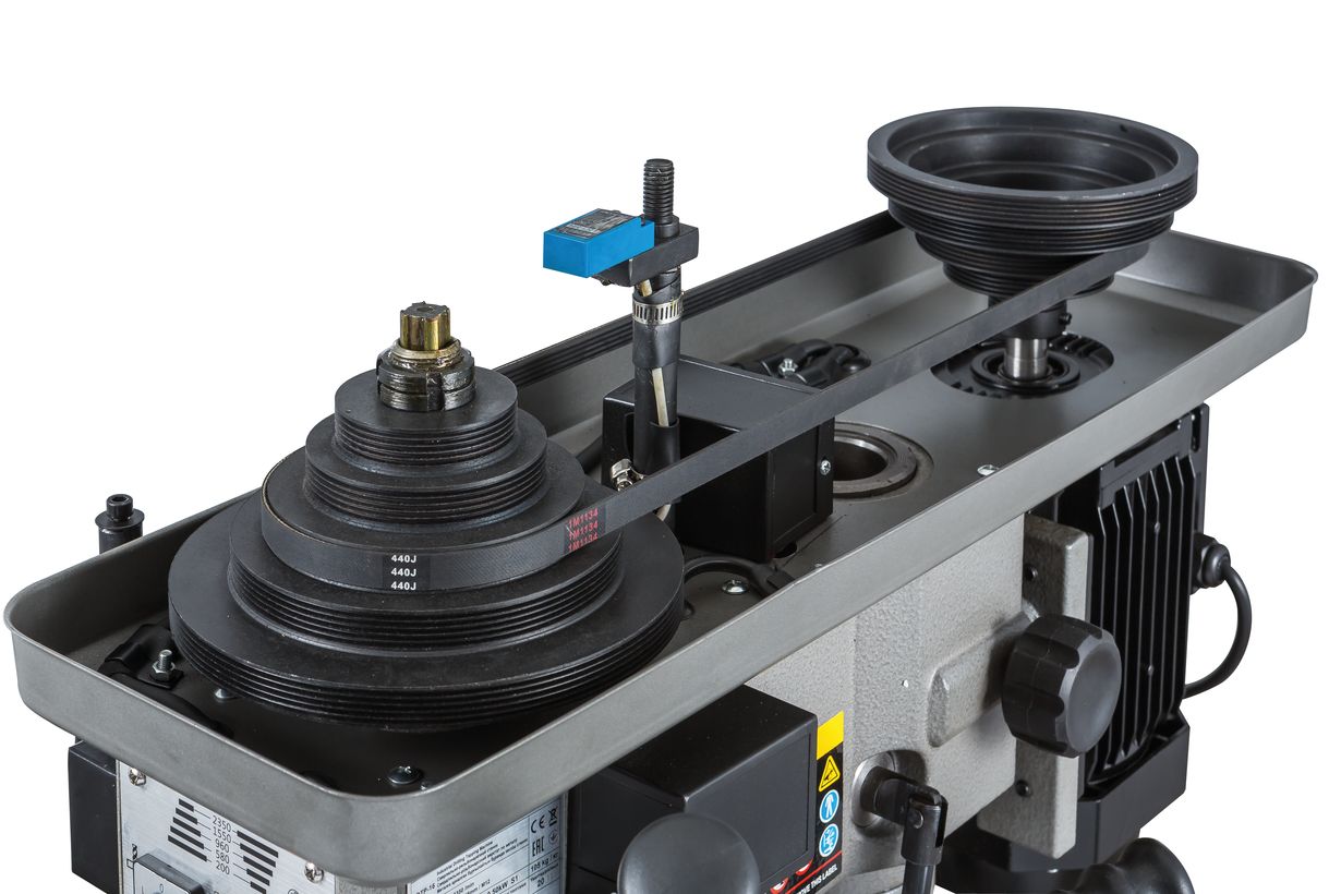 Станок сверлильный настольный IDTP-16 возглавил новую линейку станков JET с возможностью нарезать резьбу. Данный станок производится в Китае, что позволяет снизить стоимость изготовления, а это непосредственно влияет на цену станка в России. Станок оснащен мощным двигателем 500Вт и способен в режиме долгих нагрузок нарезать резьбу до М12. На станке установлен асинхронный двигатель, на который установлен шкив с 5-я ручьями, перекидывая ремень по ручьям шкива, вы меняете скорость от 200 до 2350 оборотов в минуту. Данное решение в тандеме с легкой натяжкой двигателя и надежной фиксацией, позволяет сохранить и передать хороший момент на шпинделе. Основание станка отлито из серого чугуна, станок устанавливается на верстак или стол, подстолье и фиксируется болтами. Надежная фиксация позволяет уменьшить вибрации. В основание вставляется толстостенная труба, на которую непосредственно крепится голова сверлильного станка. В управление станок достаточно прост.