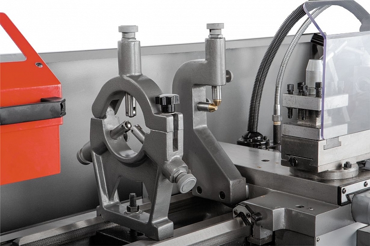 Фартук суппорта работает в масляной ванне, задняя бабка регулируется в поперечном направлении, что дает возможность обточки конических заготовок. Станок поставляется в максимальной комплектации. В нее входят система подача СОЖ, люнеты, планшайба, дополнительный 4-х кулачковый патрон, переходная втулка, вращающийся и не вращающийся центры, опоры для выставки станка, набор инструмента и лампа освещения рабочей зоны.