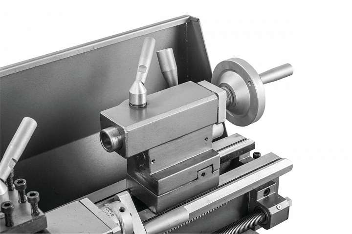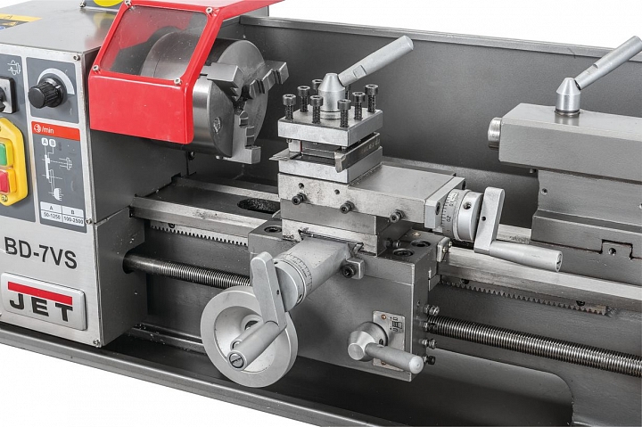 Настольный токарный станок BD-7VS имеет автоматические продольные подачи, которые позволяют точить в автоматическом режиме, всего их две, 0,1 мм на оборот шпинделя и 0,2 мм на один оборот шпинделя. Настаиваются подачи, с помощью гитары подач, ровно так же мы настраиваем и гитару для нарезания резьбы. Всего станок способен нарезать 14 метрических и 12 дюймовых резьб, включение резьбы происходит с помощью рукоятки на суппорте, зажатием маточной гайки на вал, так же мы включаем и автоматическую подачу.