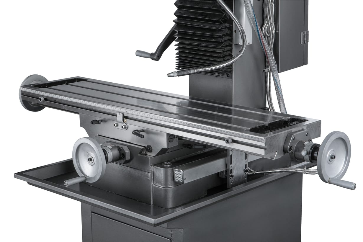 Модель JMD-50LPFD оснащена рабочим столом размером 1000 x 240мм, который перемещается по направляющим типа ласточкин хвост и имеет возможность перемещения по осям X, Y на величину 760мм и 190 мм соответственно. На столе имеется три Т-образных паза шириной 14 мм для закрепления деталей прихватами или установки тисков и других приспособлений. Опционально станок может быть дооснащен устройством автоматической подачи, которое устанавливается с левой стороны рабочего стола и позволяет осуществлять подачу по продольной оси в автоматическом режиме, улучшая качество получаемой поверхности и увеличивая производительность изготовления деталей. Также устройство имеет функцию ускоренного перемещения рабочего стола для сокращения времени подвода инструмента к детали и его отведения, для удобной установки/снятия обрабатываемой детали.