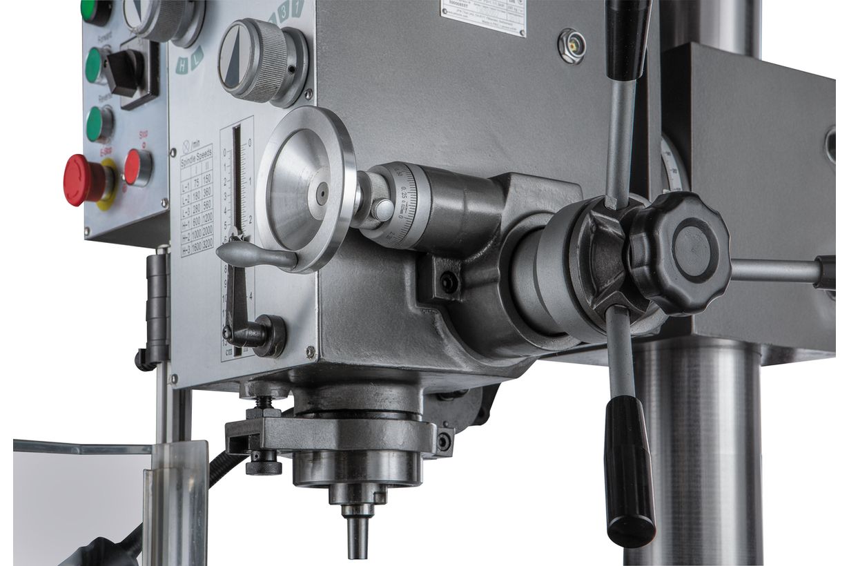 Модель оборудована мощным асинхронным электродвигателем - 1,1/1,5 кВт, обеспечивающий частоту вращения шпинделя в 2-х диапазонах 75-1600 об/мин и 150-3200 об/мин. Станок оборудован коробкой скоростей для выбора необходимой частоты вращения, по 6 скоростей в каждом из двух диапазонов. Функция включения реверса шпинделя позволяет осуществлять нарезание резьбы.