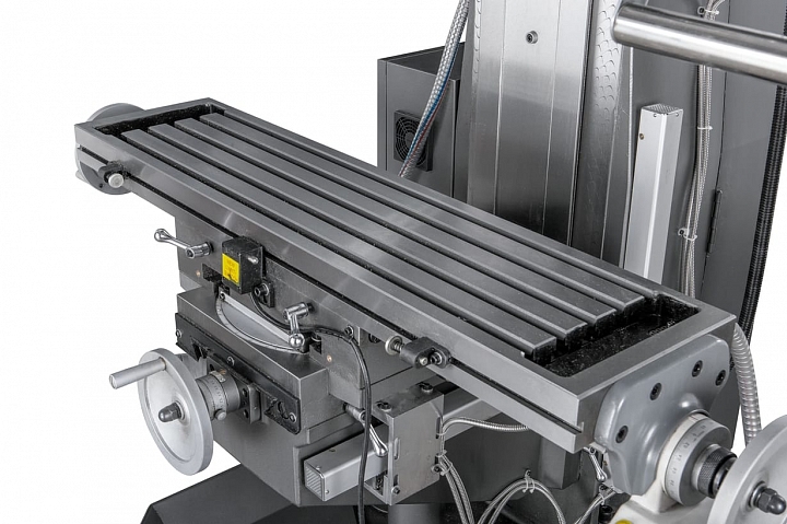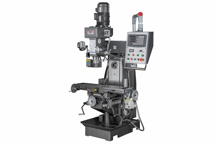 На станке JMD-939GHV DRO можно производить сверление отверстий до диаметра 30 мм и фрезеровать концевыми фрезами до диаметра 20 мм. На станке установлены вертикальный и горизонтальный шпиндели со скоростями вращения 100-2000 / 60-1350 об/мин соответственно. Расстояния между вертикальным шпинделем и столом от 70 до 370 мм, вертикальным шпинделем и поверхностью колонны от 250 до 650 мм; горизонтальный шпиндель-стол – от 20 до 320мм. Выбор скоростей вертикального шпинделя осуществляется с помощью бесступенчатой регулировки частоты вращения шпинделя с ее индикацией на пульте управления. Скорость вращения горизонтального шпинделя изменяется посредством клиноременных передач.