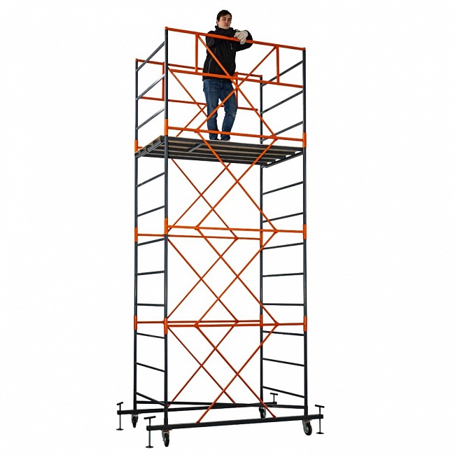 Вышка состоит из колесного основания, лестничных стальных рам секций и секции ограждения, которые соединяются между собой металлическими диагональными связями и гантелями, придающих ей устойчивость и обеспечивающих безопасность работ на высоте. Простая конструкция - сборка не требует профессиональных навыков и дополнительного инструмента. Все элементы вышки стыкуются между собой по принципу "труба в трубу" и фиксируются флажковым механизмом.