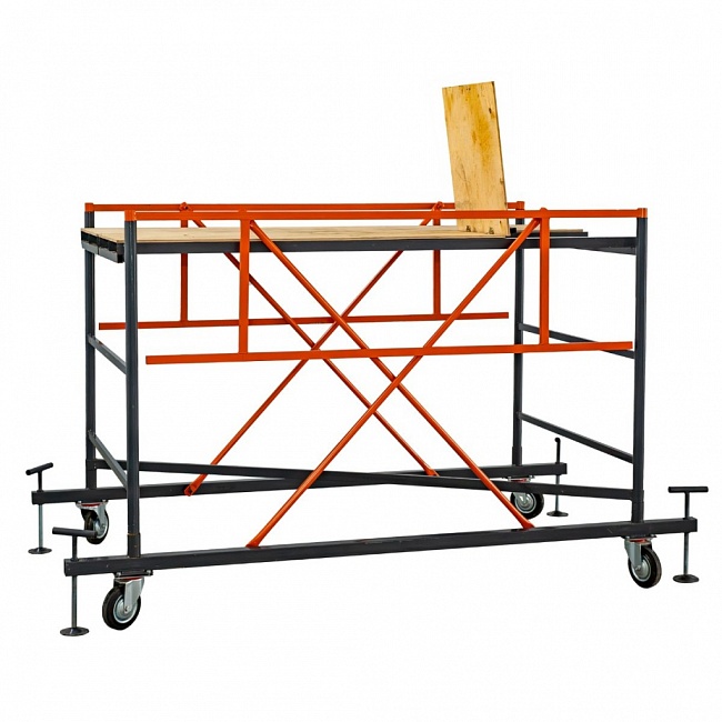 Отличает вышку строительную ВСП TeaM 250/1.2 изготовление из стальных труб, которые для большей долговечности и устойчивости к химическим веществам покрыты защитной полимерной краской. С помощью обрезиненных колес данную вышку-туру можно быстро и без больших физических усилий переместить с одного места на другое. В момент проведения работ вышку необходимо зафиксировать тормозными винтовыми опорами, находящихся рядом с каждым колесом. Также ими можно тонко отрегулировать высоту вышки. Это необходимо, если вы работаете на неровной площадке.
