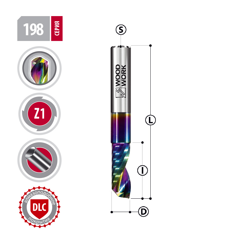 • Фрезы монолитные спиральные UpCut c DLC покрытием Серия 198 Woodwork подходят для ручных фрезеров и станков ЧПУ