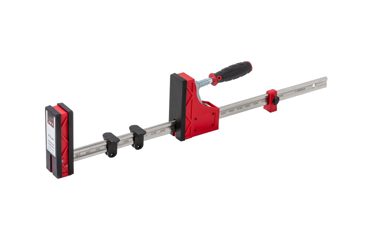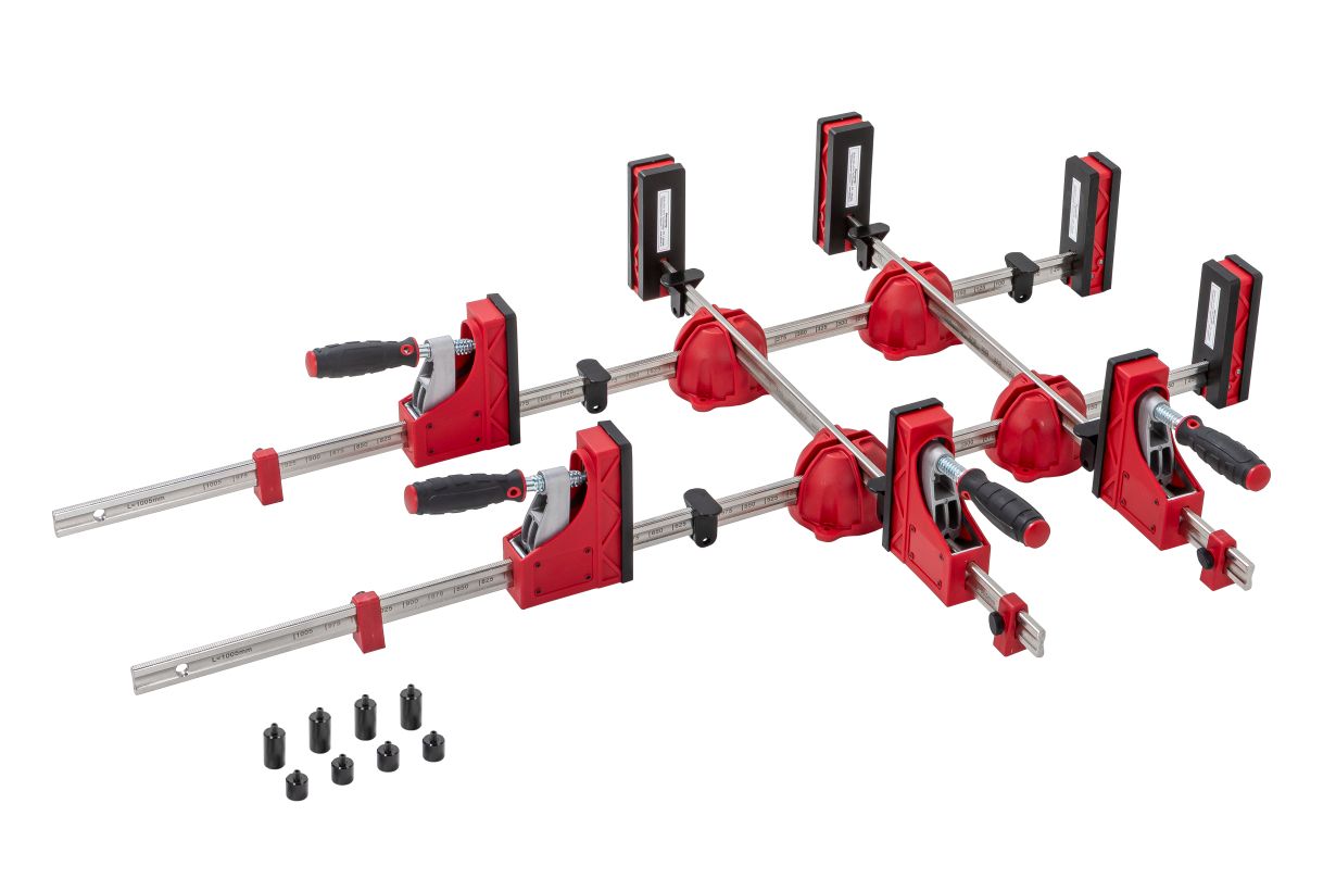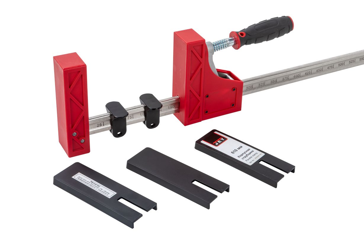 JET JC-12 набор корпусных струбцин с необходимыми для удобной работы принадлежностями, предназначен для сборки на клею конструкций из дерева. Включает в себя четыре корпусных струбцины , 2 шт по 1015 мм и 2 шт по 615 мм и большой набор вспомогательных приспособлений, а именно : крестовые блоки-стойки («крест на крест») для удерживания четырех струбцин одновременно под строго фиксированным углом в 90 градусов и набор из 8ми стальных цилиндров фиксации струбцин в стол. Их необходимо установить в струбцины и/или в крестовые стойки для их фиксации на рабочей поверхности с круглыми монтажными отверстиями стандартного размера 19мм.