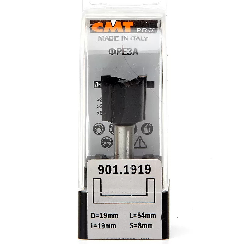 • Фрезы CMT PRO для выборки паза под петли снабжены мощными врезными твердосплавными напайками с наклоном режущей части (бреющий угол)